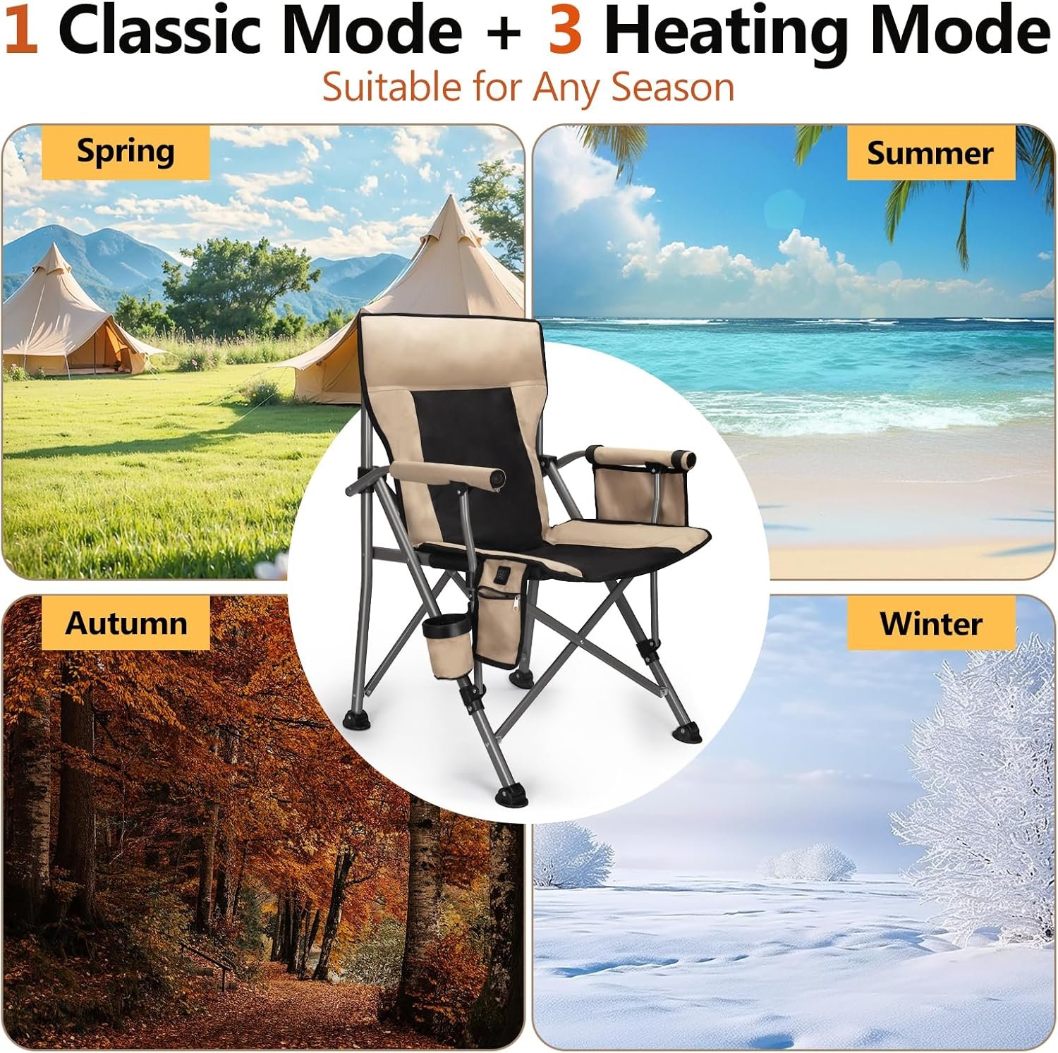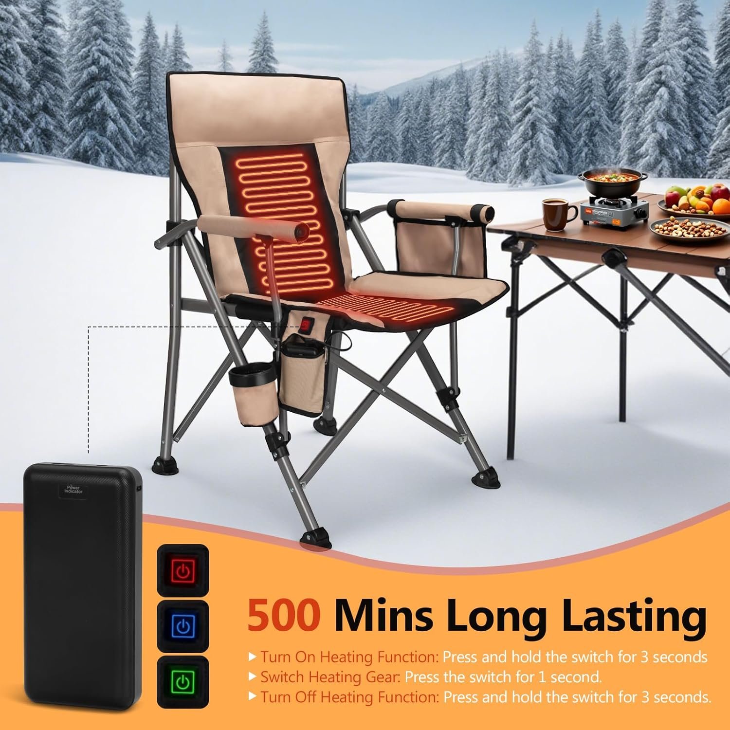 - 【Full Coverage Heating, 3-Speed Heating Mode】The heated camping chair has heating zones on the back and seat, which can easily realize full-coverage heating, so that you can fully enjoy the warmth in the cold winter. With three heating gears, you can choose the most suitable temperature according to your needs.