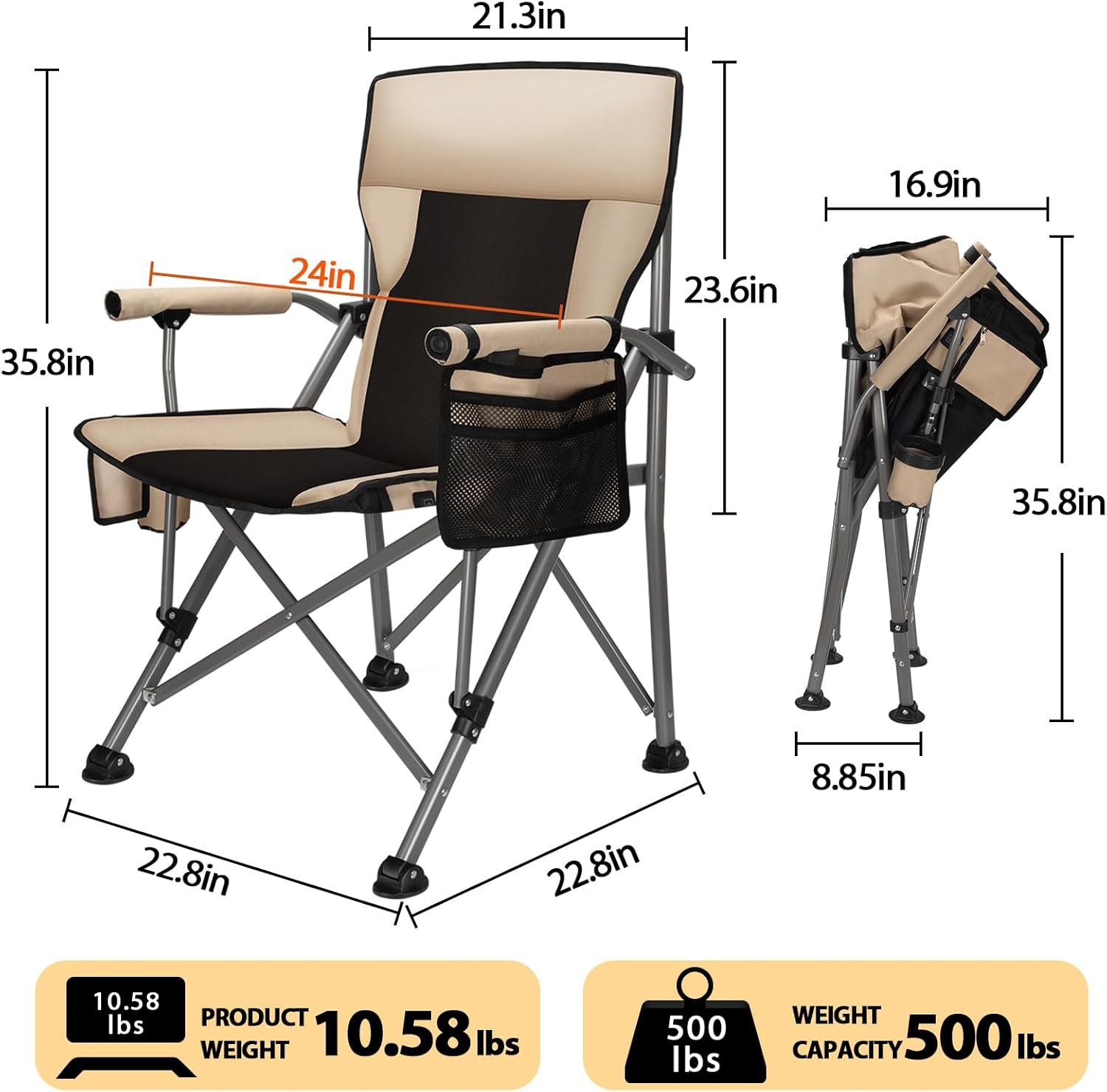 - 【Weight Capacity 500 lbs】Thanks to the alloy steel material and X-shaped rigid structure, the lightweight camping chair can easily support 500lb. At the same time, the steel of the camping chair is covered with anti-corrosion and corrosion-resistant protective coating by gold-plating process, which is waterproof and sunproof, perfect for outdoor activities.