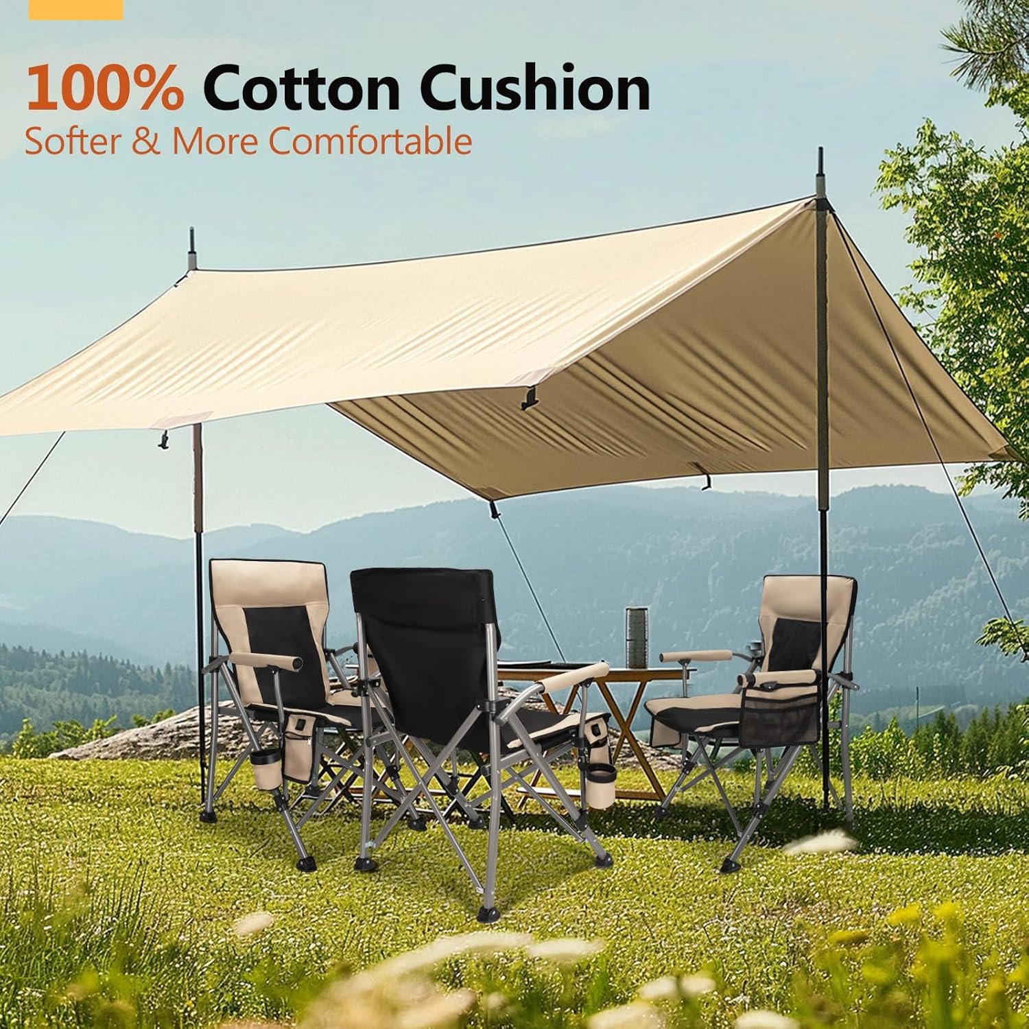 - 【Softer and More Comfortable】Distinguished from ordinary camping chairs, the backrest and seat of the camping chairs use a lot of padding and soft fabric, which makes it more comfortable to sit. The wide footrest makes the seat more stable, and the oversized armrests allow you to rest your hands at any time.