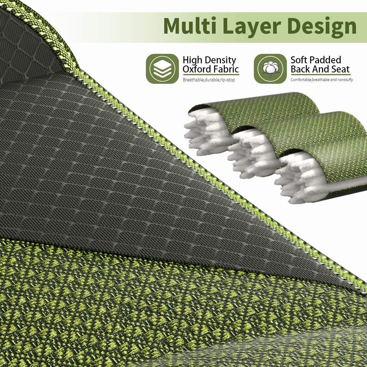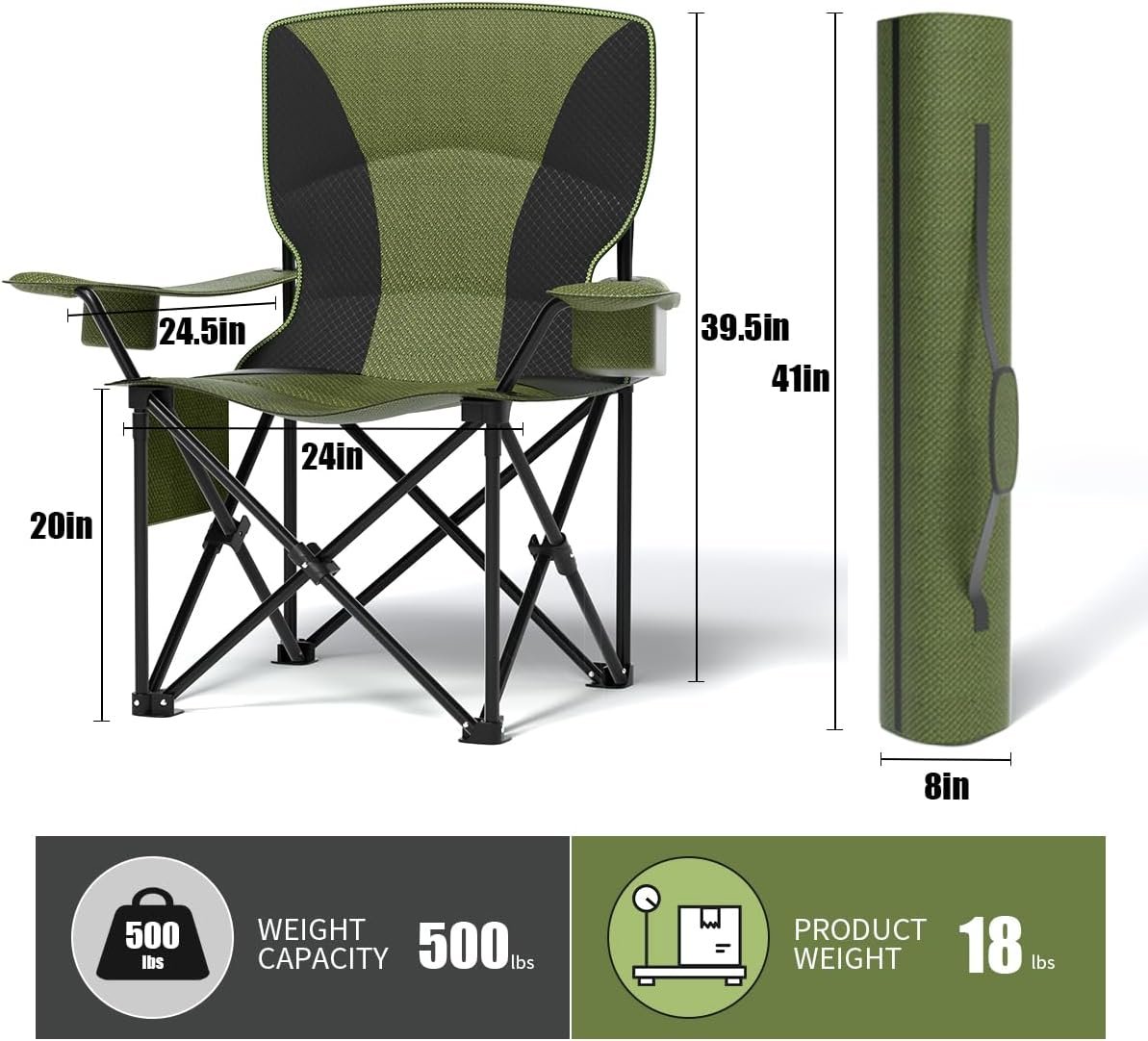 - 【Heavy Duty Folding Chair – 500LB Max Weight】Built with 22mm thickened steel tubes 30% stronger than competitors and 1680D double-layer Jacquard fabric + padded Oxford lining, these chairs support 500lbs per chair . Reinforced joints and anti-slip feet ensure stability on grass, sand, or uneven terrain