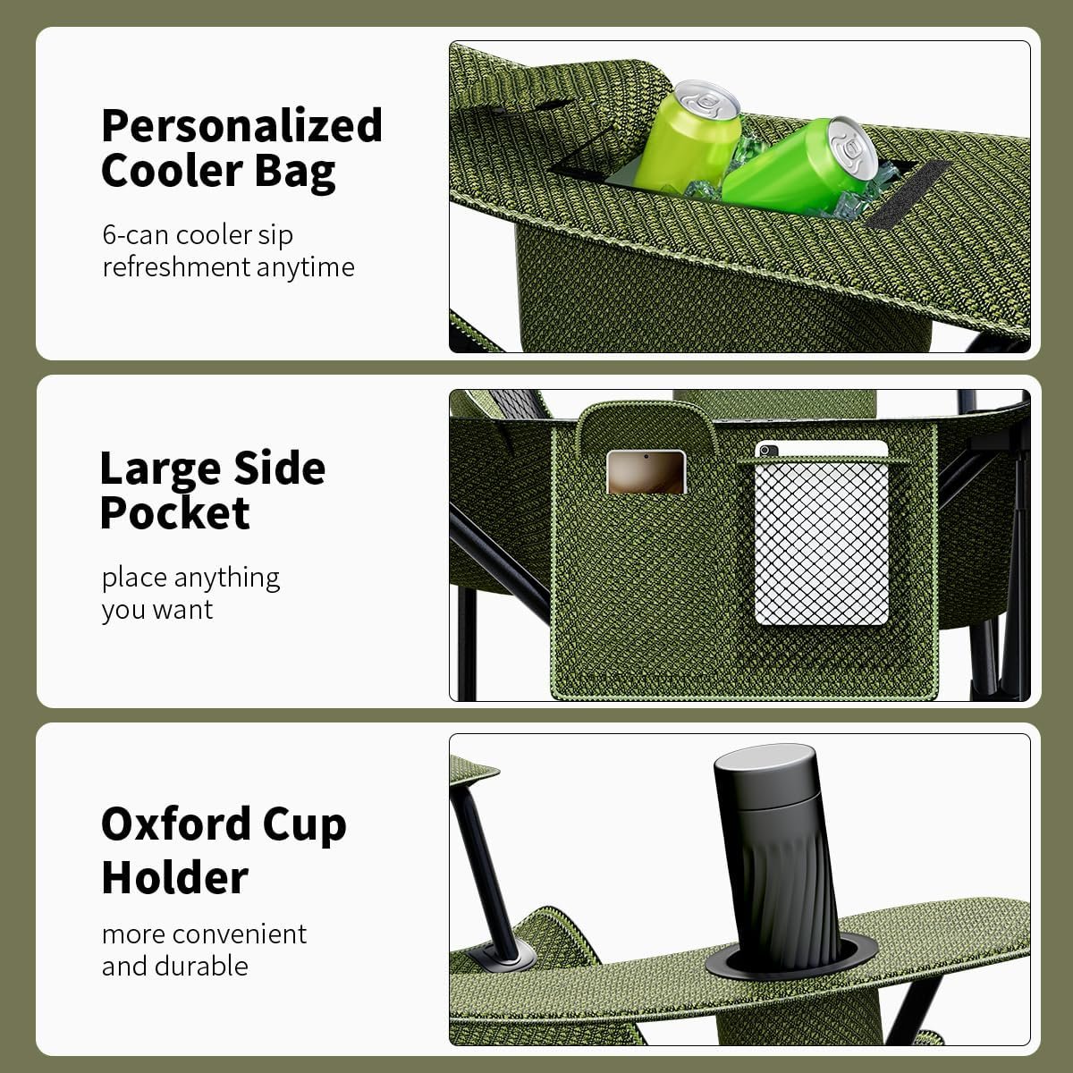 - 【Camp Chairs – 4-in-1 Storage & Cooling】Includes mesh cup holders fits tumblers/water bottles, oversized side storage pouch holds phones/books, 6-can insulated cooler bag double-layer Oxford fabric keeps drinks cold, and a nylon carry bag folds to 40in for easy transport—perfect for camping essentials